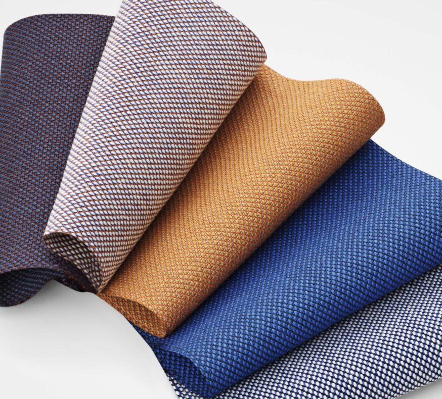 Steelcut Trios tredimensionella yta påminner om små pyramider eller stålpunkter. Trots den komplexa väven har textilen ett enkelt och precist uttryck. Steelcut Trio är garnfärgat och tillverkat av tre olika färgade garn.